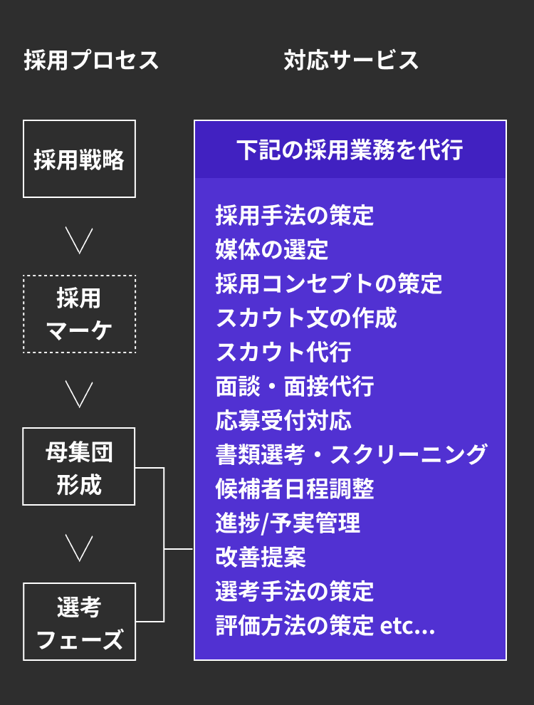 そんな時、弊社では採用担当者を雇用するよりも低コスト、高スピードで採用体制を構築します